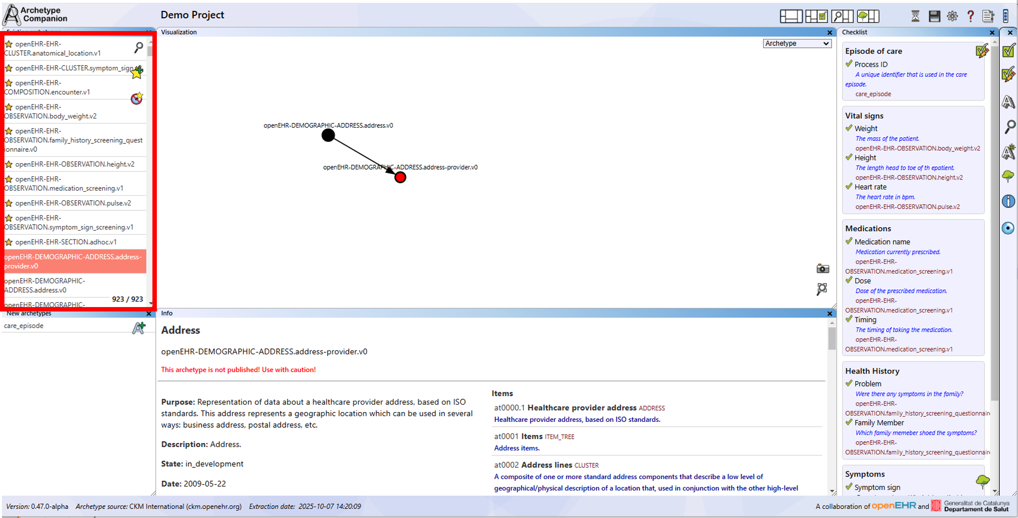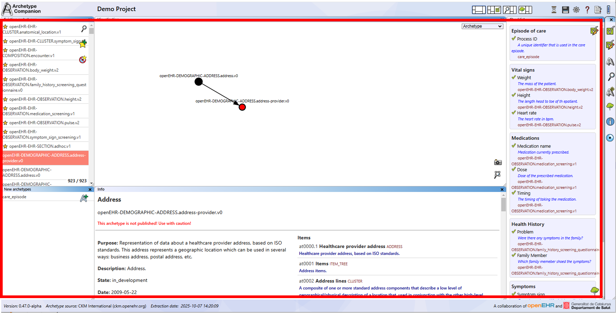 The main function of the application is browsing and searching openEHR archetypes. In addition to an easily accessible list of archetypes, this application provides a fast search engine for an openEHR archetype repository, allowing you to find archetypes relevant to your needs.