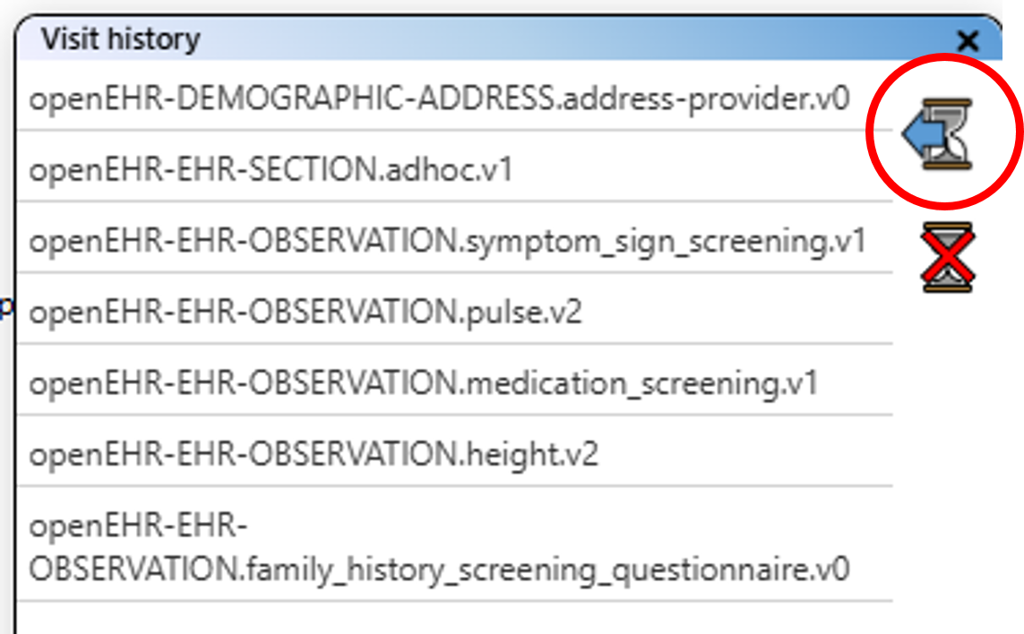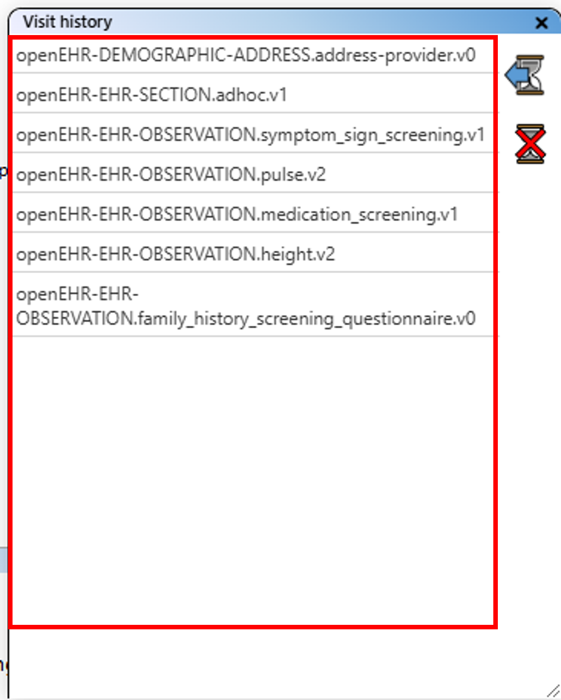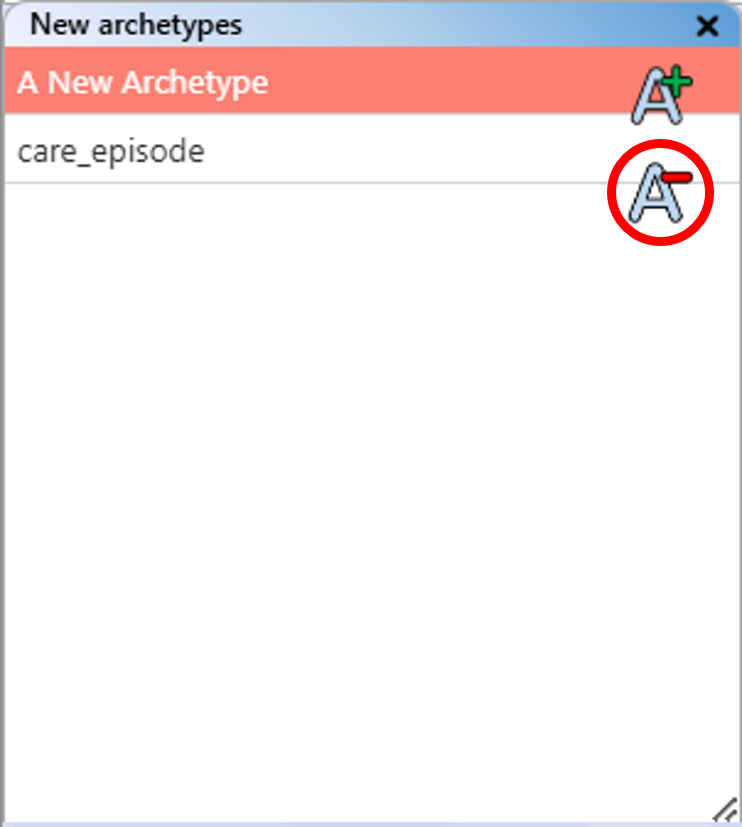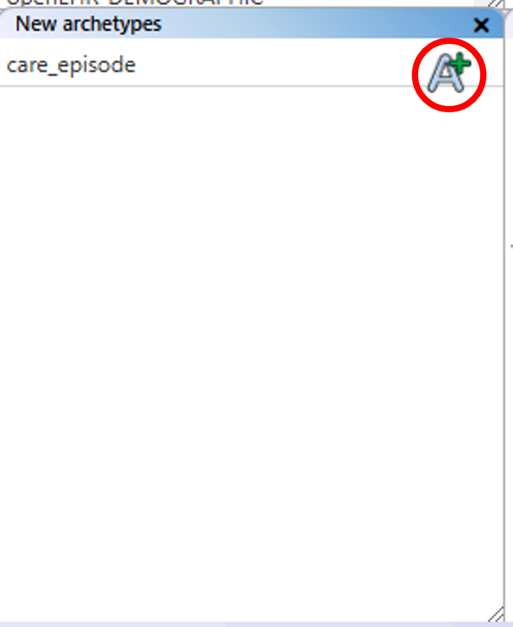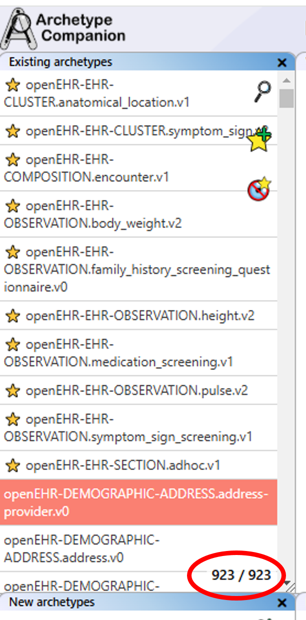 The information for archetypes extracted from a repository is presented as an alphabetised "Existing archetypes" list of archetype IDs on the left-hand side of the standard view. You can scroll through the list using the mouse wheel while hovering over it, or by using the scroll bar on the right-hand side.