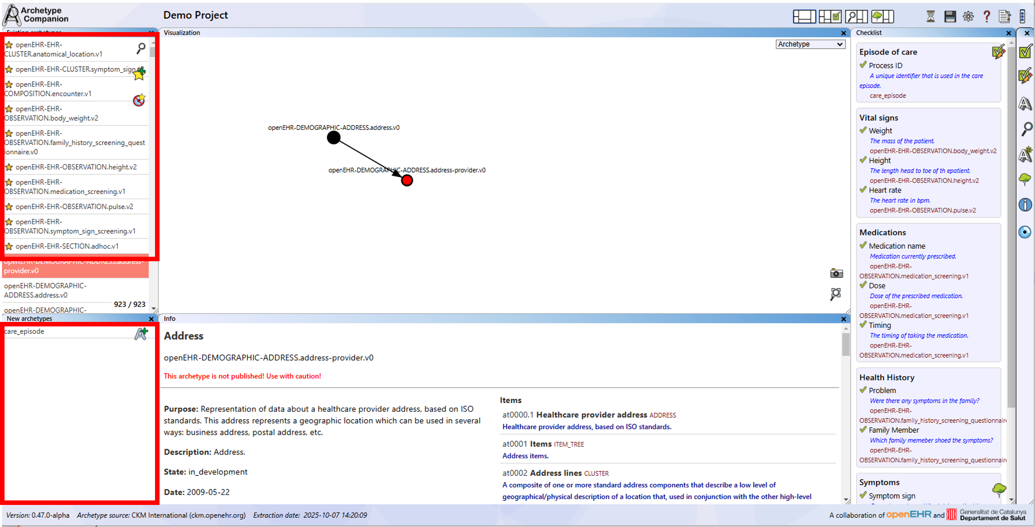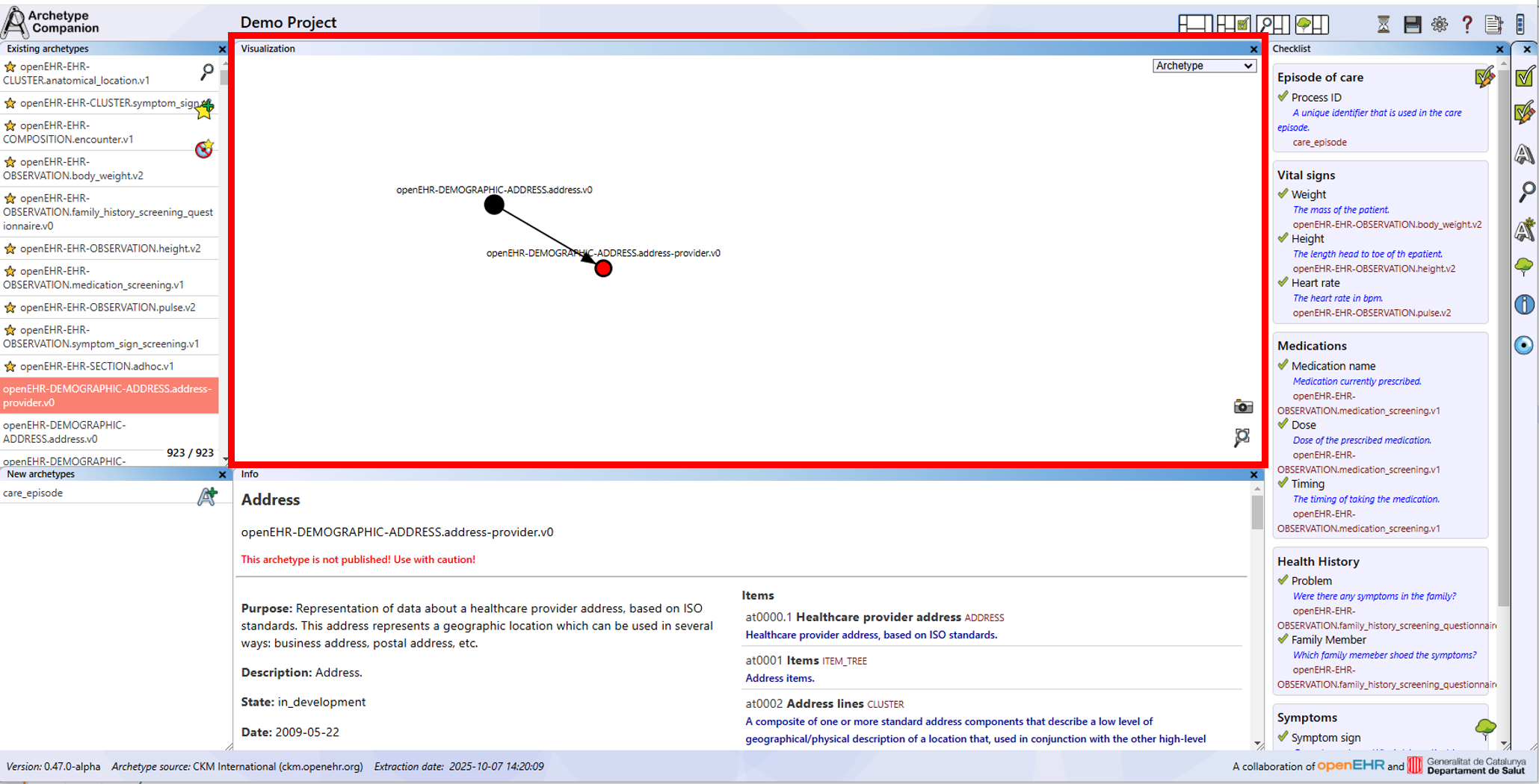 Note: The information about openEHR archetypes presented in this tool has been extracted automatically from external sources (such as CKM) and is provided for convenience only. We do not guarantee the accuracy, completeness, or correctness of the extracted data, nor do we claim that it is up to date. This tool does not assert or imply any copyright ownership over the archetypes themselves. For authoritative information regarding authorship, copyright, and licensing, users are strongly advised to consult the original archetype source as stated within the tool.