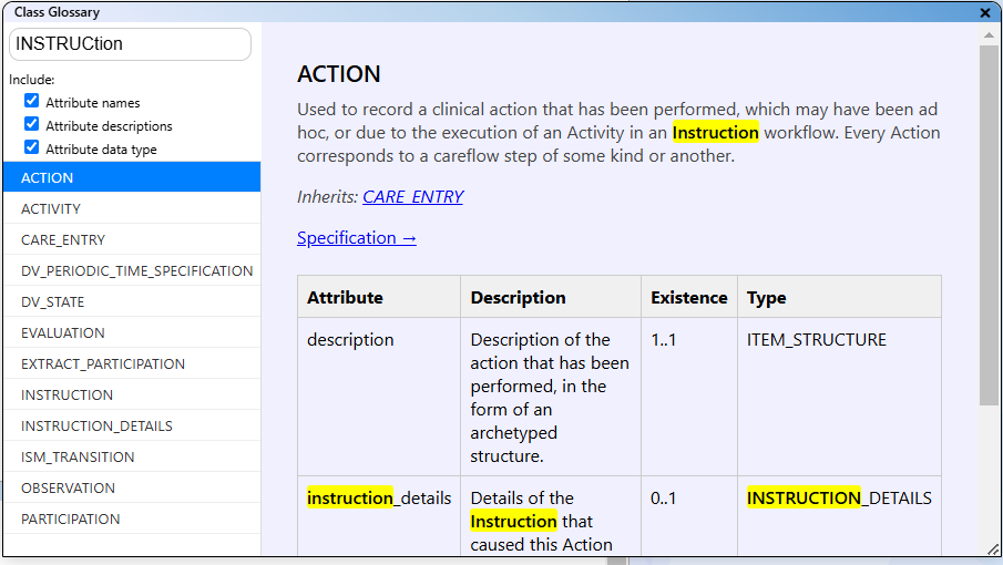 The Archetype Companion provides a glossary of openEHR classes. The information on openEHR classes has been extracted previously from the following sources: