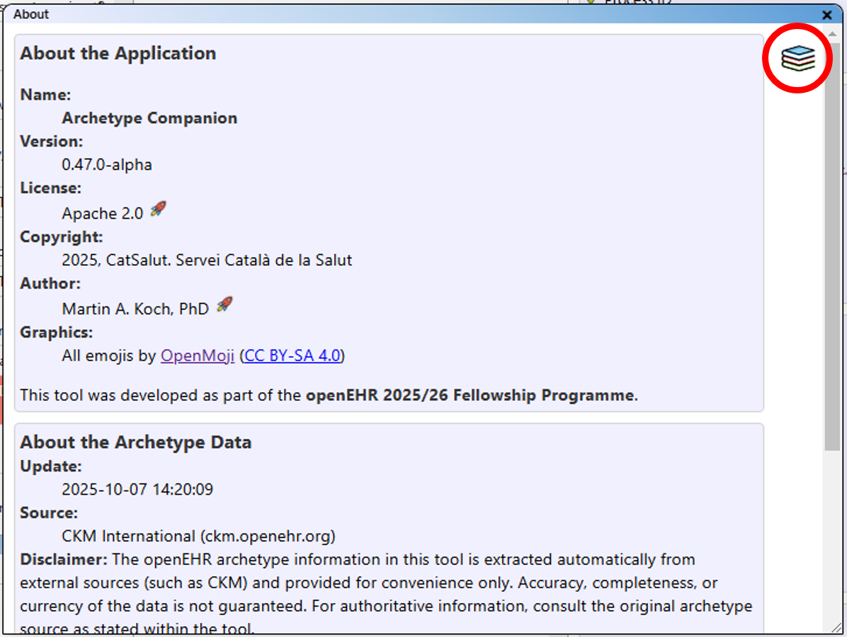 Information about the application and the archetype data can be accessed via the "About" button in the upper right-hand corner of the main view.