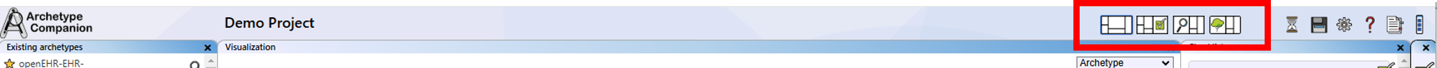 Also, at the top you will find the four predefined view configurations available in the Archetype Companion. These standard views are designed to support different aspects of the application (from left to right):
