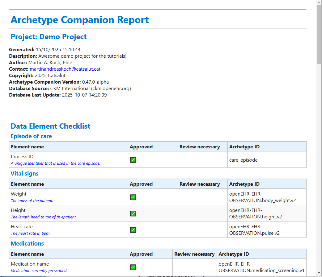 This produces a simplified HTML view of all project data elements and assigned archetypes, which you can print as a PDF for documentation.