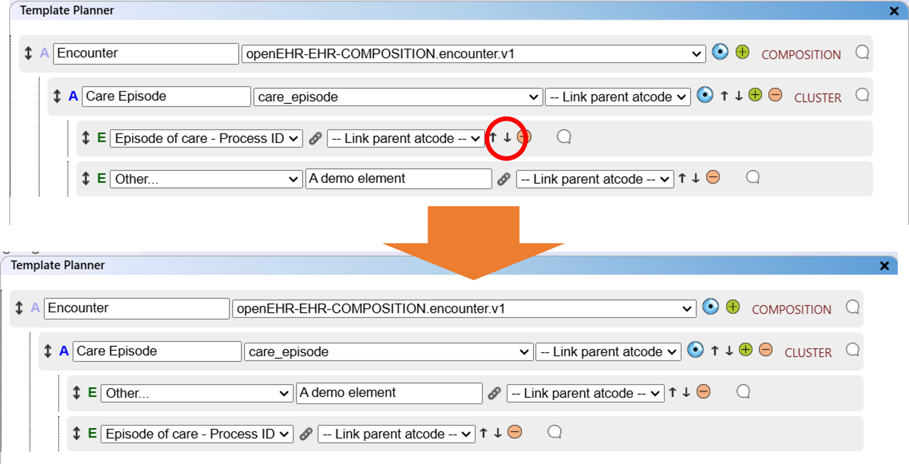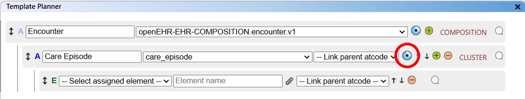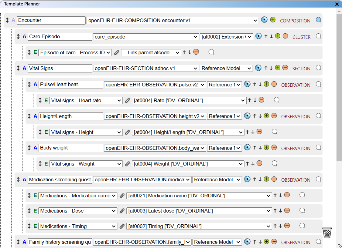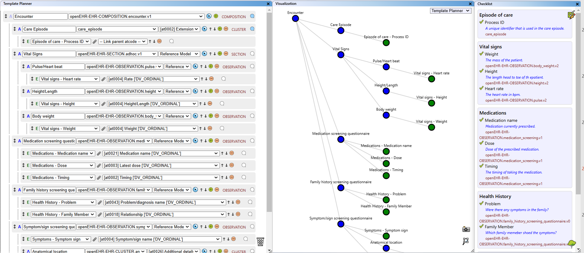 - The "Template Planner" view displays the archetype and data element structure created with the Template Planner module.