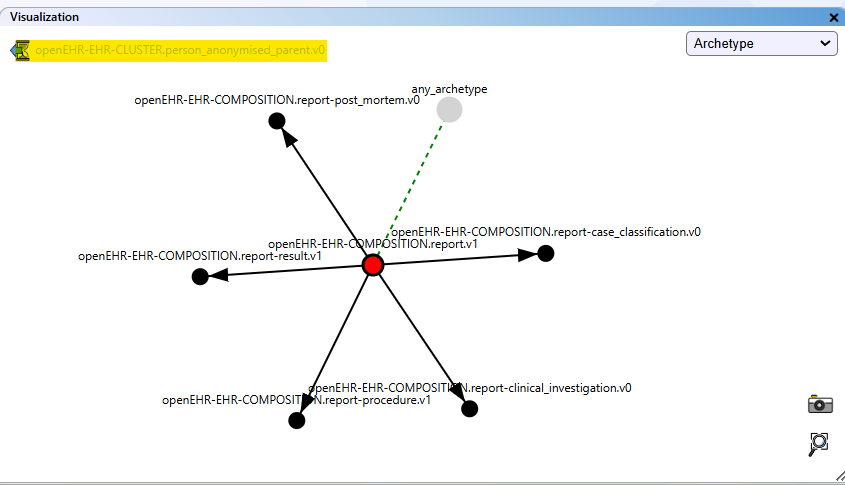 - Archetypes are shown as blue nodes, data elements as green nodes.